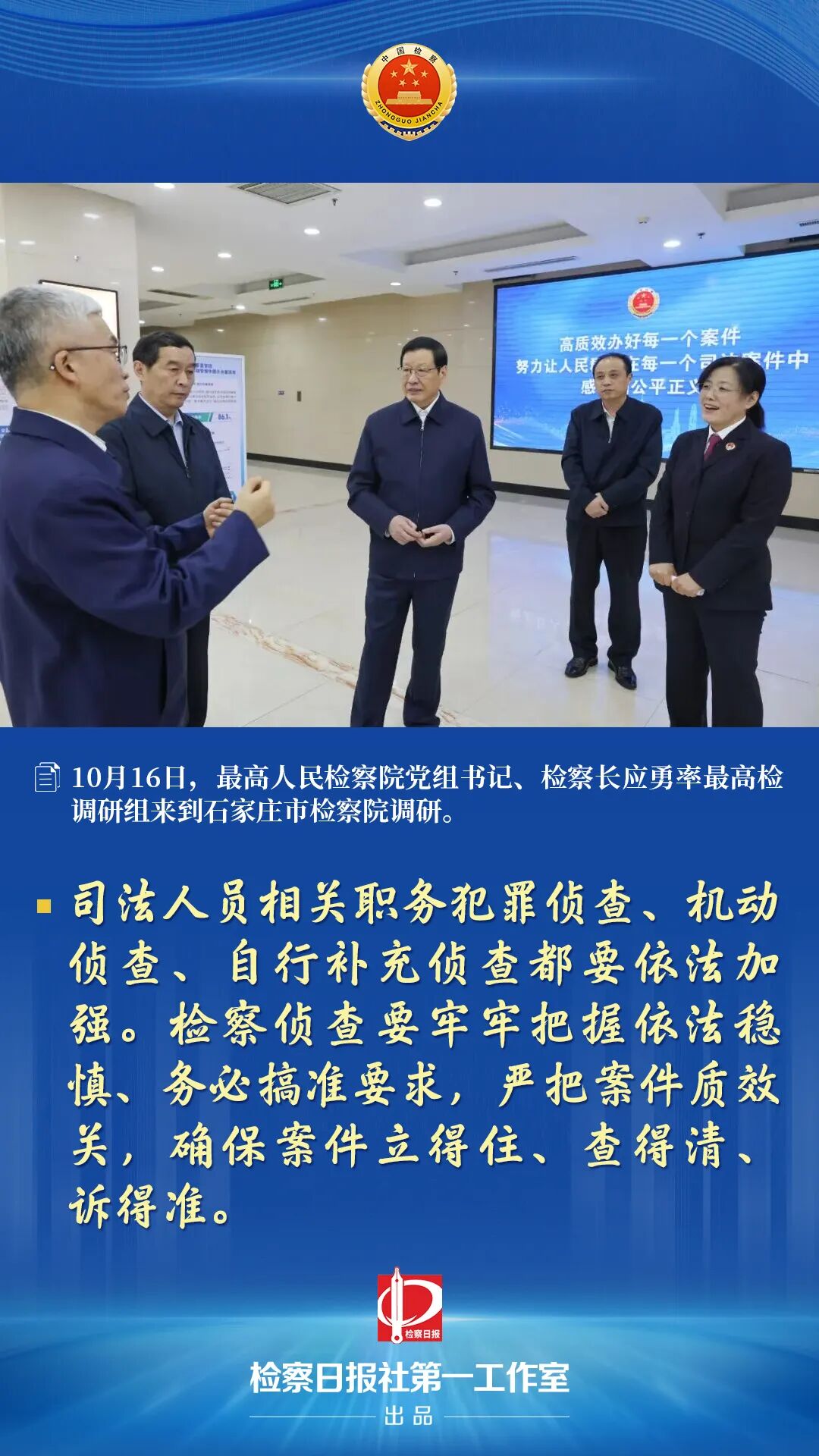 10月15日至17日,最高人民检察院党组书记、检察长应勇率最高检调研组到河北保定、石家庄调研时,再次对检察管理、检察侦查两项工作作出指示。