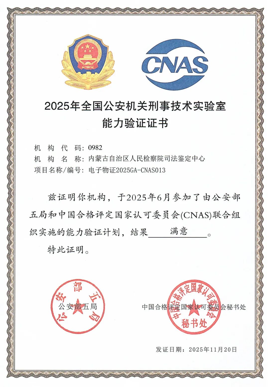 近日,全国刑事技术实验室能力验证活动成绩公布,内蒙古自治区人民检察院司法鉴定中心参与的电子物证能力验证,取得“满意”的优秀成绩。实验室能力验证是公安部与中国合格评定国家认可委员会(CNAS)联合开展的,评价结果分为满意、基本满意、不满意三个等级。其作为司法技术服务办案质效的“试金石”,覆盖技术标准符合性、操作流程规范性、鉴定结果准确性等全链条维度,其评价结果是衡量鉴定机构专业水平的核心标尺,具有极强的权威性和行业认可度。