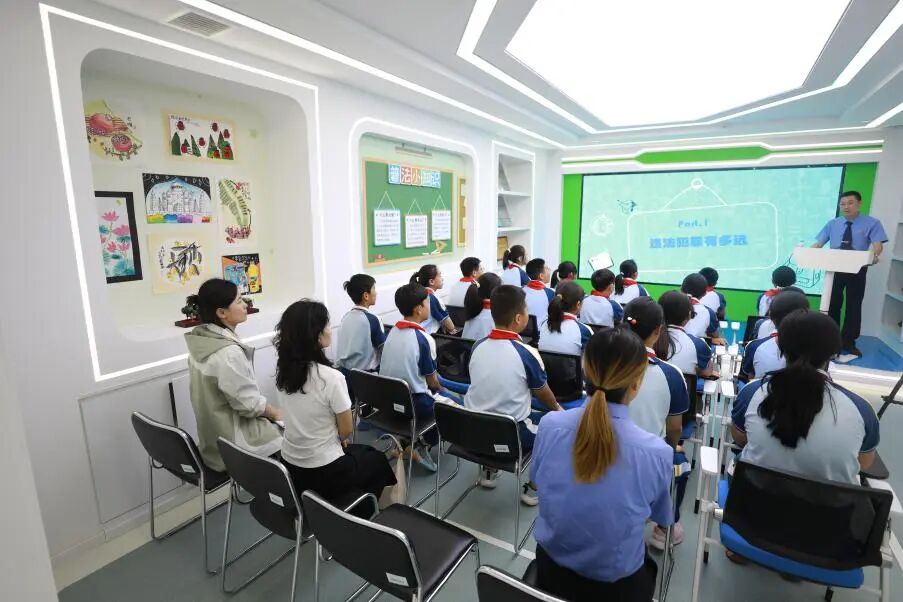伴随着参观者的脚步,未检历程科技走廊的投影一一亮起,像一条法治时光轴,讲述着未成年人检察发展的峥嵘岁月。穿过走廊,就来到了主题馆。主题馆充分运用“场景+数字化”模式,互动区设置六块交互屏,可以进行互动答题和游戏。孩子们被互动游戏吸引,一只只小手高高举起,争先恐后地抢答,热烈的气氛将活动推向高潮。