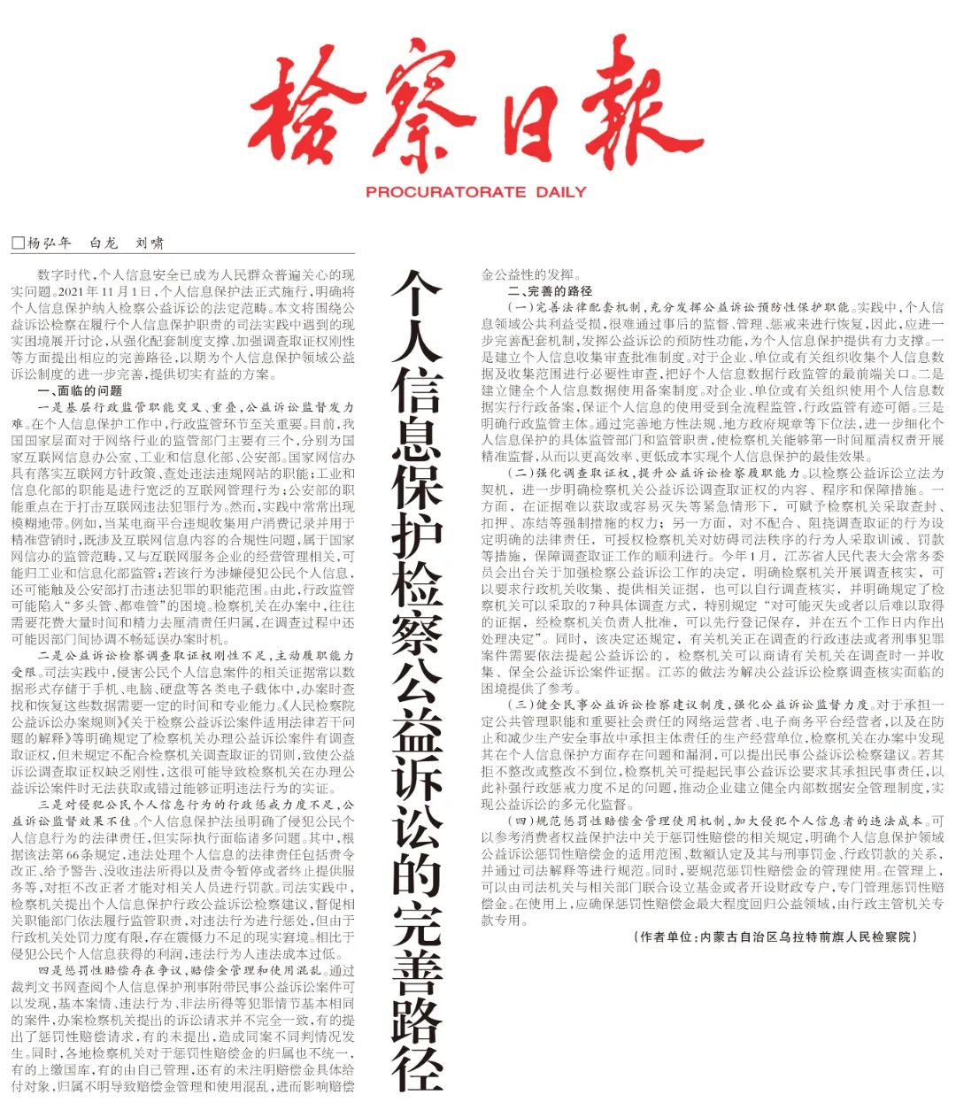 (一)完善法律配套机制,充分发挥公益诉讼预防性保护职能。实践中,个人信息领域公共利益受损,很难通过事后的监督、管理、惩戒来进行恢复,因此,应进一步完善配套机制,发挥公益诉讼的预防性功能,为个人信息保护提供有力支撑。一是建立个人信息收集审查批准制度。对于企业、单位或有关组织收集个人信息数据及收集范围进行必要性审查,把好个人信息数据行政监管的最前端关口。二是建立健全个人信息数据使用备案制度。对企业、单位或有关组织使用个人信息数据实行行政备案,保证个人信息的使用受到全流程监管,行政监管有迹可循。三是明确行政监管主体。通过完善地方性法规、地方政府规章等下位法,进一步细化个人信息保护的具体监管部门和监管职责,使检察机关能够第一时间厘清权责开展精准监督,从而以更高效率、更低成本实现个人信息保护的最佳效果。