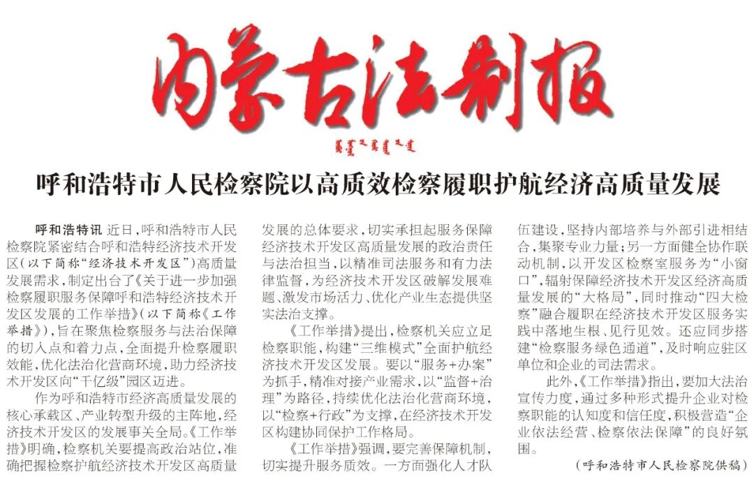 近日,呼和浩特市检察院紧密结合呼和浩特经济技术开发区(以下简称“经济技术开发区”)高质量发展需求,制定出台了《关于进一步加强检察履职服务保障呼和浩特经济技术开发区发展的工作举措》(以下简称《工作举措》),旨在聚焦检察服务与法治保障的切入点和着力点,全面提升检察履职效能,优化法治化营商环境,助力经济技术开发区向“千亿级”园区迈进。