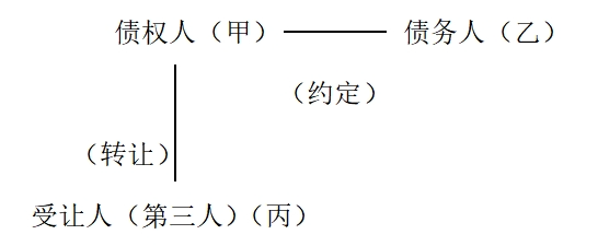 在上面的图例中,债权人甲与债务人乙约定,甲对乙的债权不得转让;但甲违反该约定,将债权(非金钱债权)转让给丙,丙成为新债权人,债务人乙需向新债权人丙履行债务。