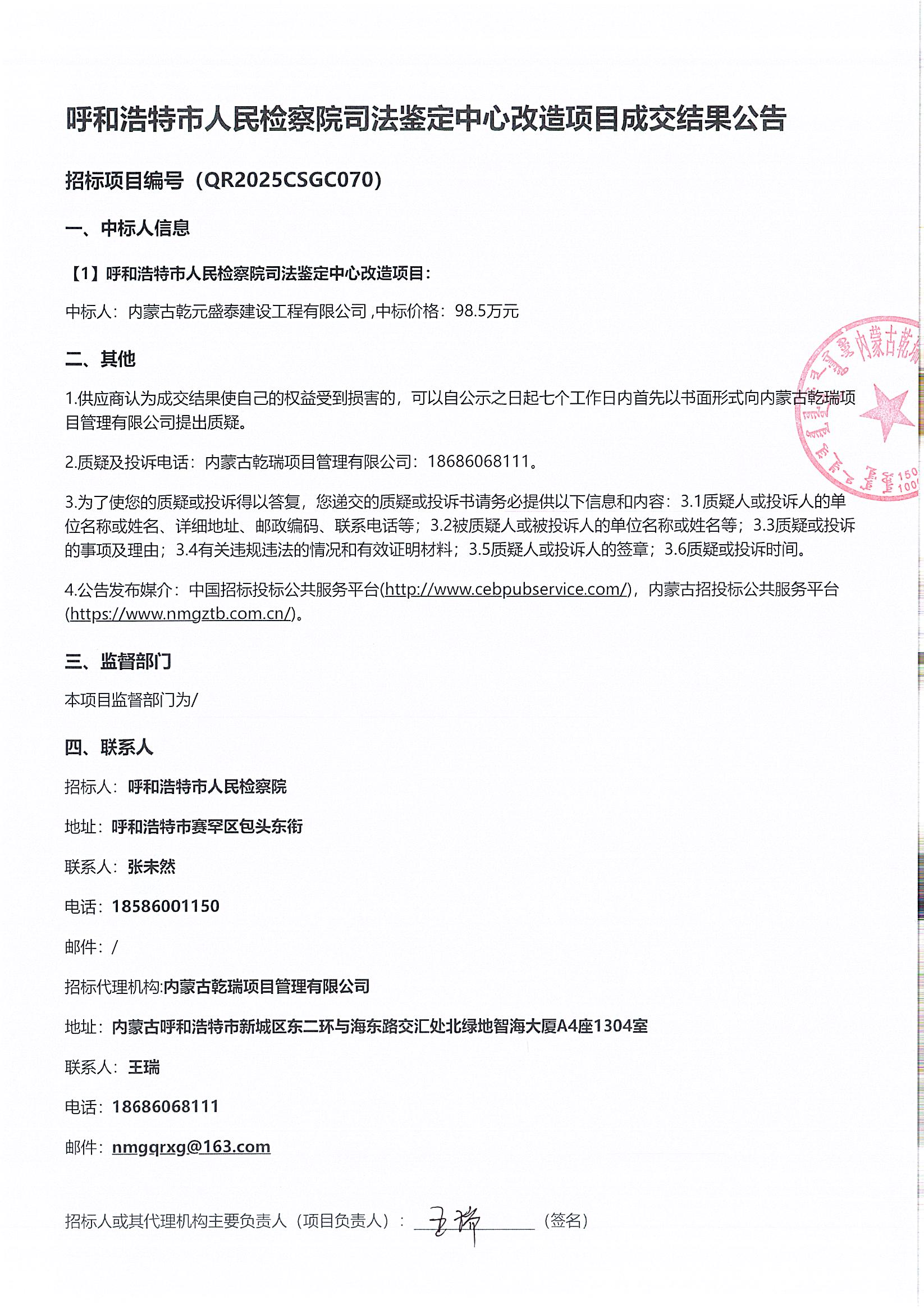 呼和浩特市人民检察院司法鉴定中心改造项目成交结果公告